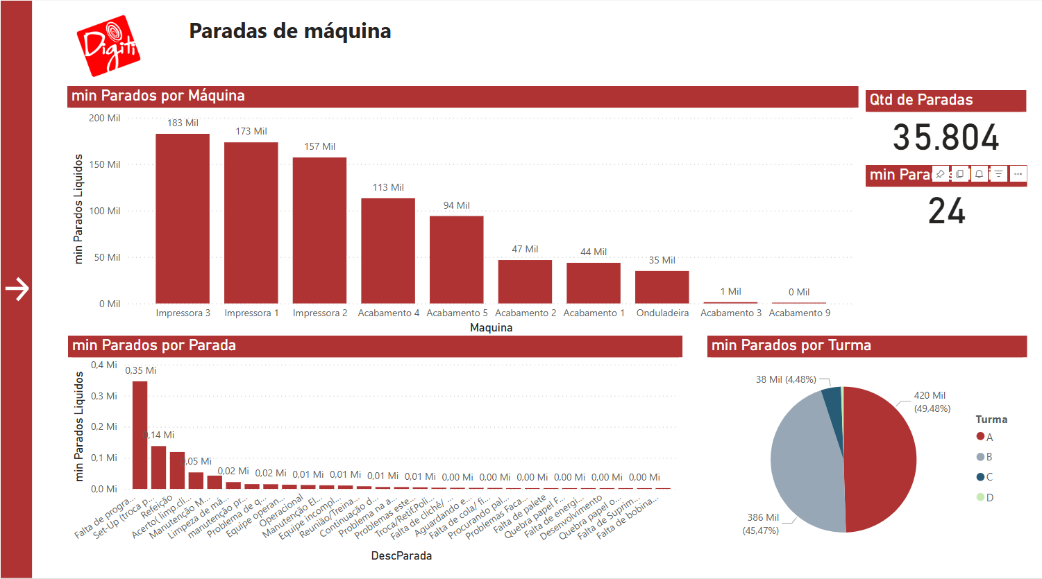 Identifique as máquinas com mais tempo parado, os tipos de paradas e os turnos mais afetados.